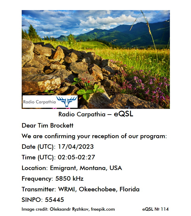 - Notes: I emailed a reception report to radiocarpathia@gmail.com . The next day I received a eQSL and helpful email from Luca Trifan.