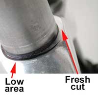 Fork Crown Race Facing In addition to a correct press fit, the flat seat of the crown race must be square to the steering column. The headset fork crown race will be pressed on the crown race and will reference the seat for bearing alignment. Without correct bearing alignment, the headset bearings may bind as it is rotated side to side. The paint on the fork may be used as a marker to track facing. A fresh cut should be seen completely around the crown. Additionally, the cut should be as wide as practical. Fork crown races tend to seat on their outer edge. This crown below shows incomplete facing. Black mark shows a low area, which would cause bearing to seat mis aligned relative to the steering column.