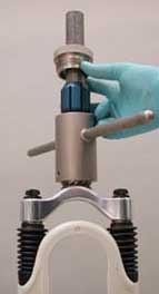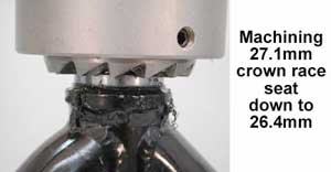 The cutting process can take a long time if the crown race must be resized. As an example, when reducing the JIS standard of 27.1mm fork crown size down to 26.4mm crown race size it is necessary to remove 0.7mm material. The cutter of the CRC-1 uses the inside edge to machine the correct diameter as it passes down the steering column. |