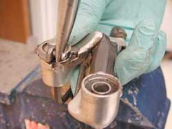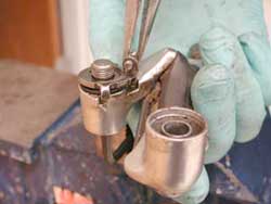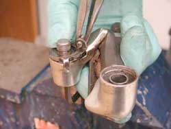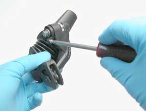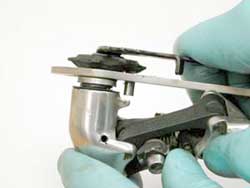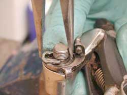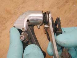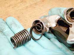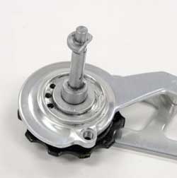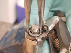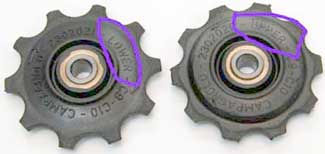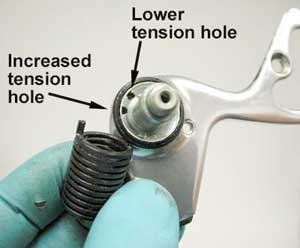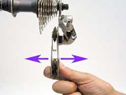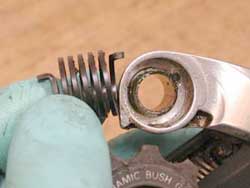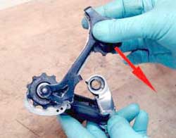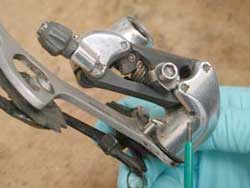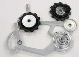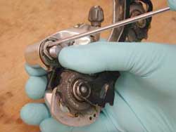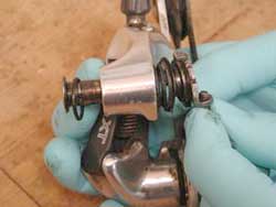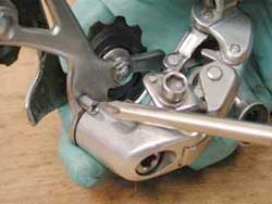 Rear Derailleur Overhaul Some rear derailleur models allow the internal servicing in order to clean and lubricate. This often improves performance by removing dirt from pivots. Additionally, some models allow for the changes to the pulley cage tension spring. There are also after-market top pivot "break-away" bolts, which may be installed in place of the original mounting bolt. It will be useful to have a note pad and pen to help you remember correct orientation of parts. Sketch any parts that seem unfamiliar, or use a digital camera for the same purpose. Have some wire ties or twine on hand to help tie parts in their correct orientation as they come apart. Begin by removing the rear derailleur from the bike. Loosen inner wire pinch bolt and pull inner wire from adjusting barrel. Remove the chain if it has a master-link. Loosen derailleur mounting bolt and remove derailleur from bike. For bicycle chains with no master-link, the cage may be dismantled, which allows the chain to stay together. Note and record any marking distinguishing upper and lower pulley. Also note the orientation of the cage. Loosen and remove both derailleur pulley bolts. Remove the cage and chain from the derailleur. The derailleur may contain a tension spring in the upper pivot, at the mounting bolt. This spring controls the angle of the derailleur body. The mounting bolt spring and cage pivot spring oppose one another. Changing tension in the upper pivot relative to the lower pivot will move the derailleur body and upper pulley wheel relative to the cogs. Generally, it is desirable to have the upper pulley ride close to the cogs. Check the cog to pulley position when the chain is on the largest rear cog and the smallest front ring. If the largest cog is actually rubbing against the upper pulley, move the derailleur body back to move the pulley away. For derailleurs with the spring in the upper pulley, increase the spring tension by tightening the "B" screw, found in adjacent to the top bolt. If there is a large gap between pulley and cog, the screw should be loosened. Generally, the upper pivot spring tension should not be increased to solve the problem of chain slap or chain suck. Chain slap may be reduced slightly by this procedure, but chain suck is typically the result or worn or bent chain ring teeth, or a worn chain. Increasing the derailleur cage tension tends to have a marginal effect of chain suck. For chain slap, it is preferable to increase the tension of the pulley cage. There are limits to this procedure, as the upper mounting bolt spring tension opposes the cage spring tension. Increasing the cage spring tension will require an increase in the mounting bolt spring tension. If the derailleur B-screw is at it's limit, it is not advisable to increase cage tension. Campagnolo® derailleurs locate the B-screw in lower cage pivot. The upper spring tension is fixed. Tightening the B-screw will increase tension of the cage, allowing the pulley to move toward the cogs. Loosening the B-screw will decreases spring tension at the cage, allowing the upper pulley to move away from cogs. The screw turns a toothed plate that holds the spring end.