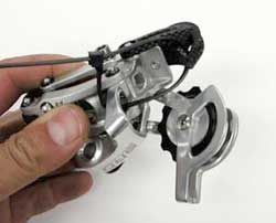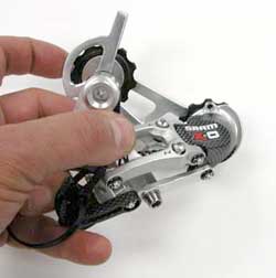 SRAM® X.0 Rear Derailleur Overhaul The X.0 derailleur may be overhauled at the lower cage pivot. The mounting bolt has no spring, and it is best to leave this bolt in place. No lubrication of the mounting bolt pivot is recommended. The SRAM® parallelogram spring is very strong. It is possible to use a zip tie to hold the derailleur body away from the cage, making it easier to work with the cage. Feed a zip tie through the body below the cable stop, and through the cable guide. Pull the cage away from the body as if shifting toward larger cogs, and secure the zip tie to hold the body.