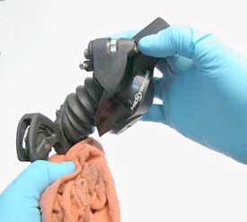 There is a boot covering the arm that extends to shift the pulley cage. Use only a soapy water on a rag to wipe this clean. Use care not get water or soap into the working mechanism.